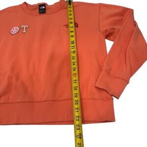 Cozy The North Face women’s crewneck sweatshirt in bright orange/coral, size M. Classic pullover with embroidered TNF logo and fun custom patches on the chest (smiley + letter T). Soft fleece interior, rib knit cuffs and hem—easy everyday layer.