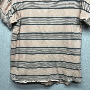 The North Face women's striped t-shirt in gray & pink. Round neck. Short sleeves. Reverse stitching. Has one small stain, please see last picture. In good used condition. No tears or holes.