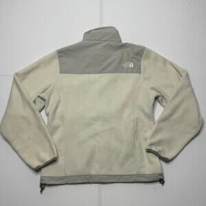 North Face full zip fleece jacket in a two-tone gray and cream colorway. Features zippered hand pockets, adjustable hem, fleece lining, and embroidered logos on front and back. Women’s size Medium. Good overall condition. Check photo 6 for small stain on back and the rest of the photos for full condition.