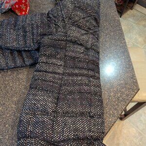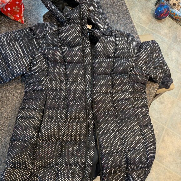 The North Face Womens Gotham Long Jacket Hooded Black Donegal Print Size L, very gently used. Purchased for our daughter and she did not like the color so tried on and not worn. The black and white are obvious to see on it, but there are some specks of green and pink in it as well