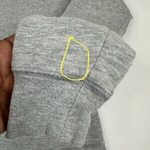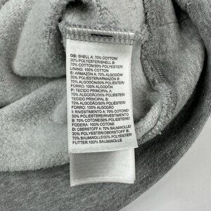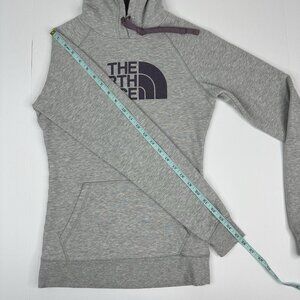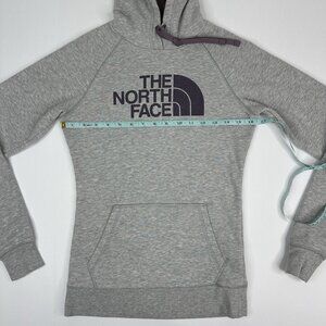 The North Face women's size extra small sweatshirt, it is gray with purple color, drawcord hooded high neckline, long sleeves, ribbed trim, large logo on front, kangaroo pocket, oversized and stretchy. Materials 70% cotton, 30% polyester. Care machine wash tumble dry low. Condition is preloved good with a small faint stain on cuff as shown in the pictures. Please preview the measurements to ensure fit.