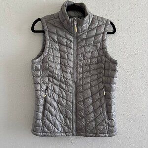 Lightweight and warm quilted puffer vest by The North Face. Features a sleek gray finish, full front zip, zippered hand pockets, and a stand-up collar for extra warmth. Women's size Small (S/P). In good pre-owned condition with light stains on the collar (see photos).