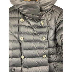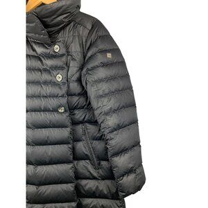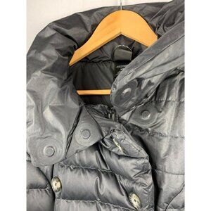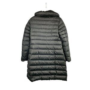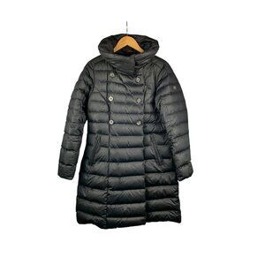 The North Face black puffer coat offers superior warmth with its down insulation and polyester shell. Ideal for cold climates, it combines functionality with style. The double-breasted design and magnetic buttons add a touch of sophistication, while the hood provides extra protection against the elements.