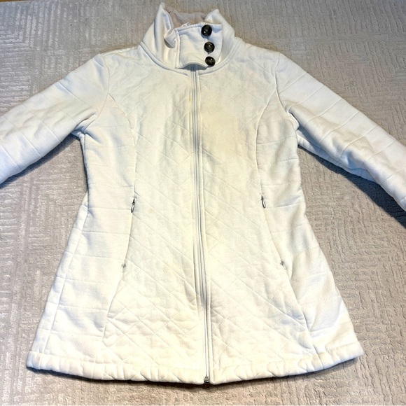 This is an absolutely beautiful jacket. Sized in women’s medium, the interior is a really soft fleece and the exterior is this heavier quilted plaid texture. In general, this has a really nice cut to it and just looks amazing. All the zippers, buttons, and clasps work as expected. No odors.
