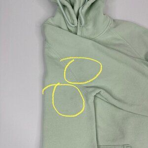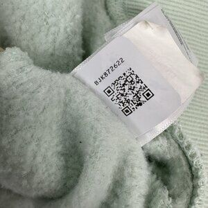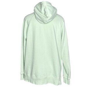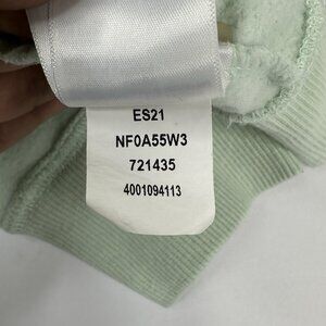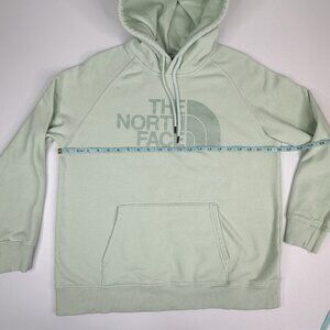 The North Face women's size large sweatshirt, it is mint green color, drawcord hooded high neckline, long sleeves, ribbed trim, large logo on front, kangaroo pocket, oversized and stretchy. Materials 70% cotton, 30% polyester. Care machine wash tumble dry low. Condition is preloved good with small faint stain on back of sleeve as shown in the pictures. Please preview the measurements to ensure fit.