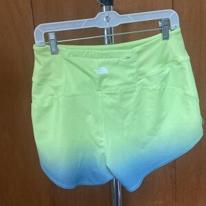 Stylish ombre shorts by The North Face. Lime green fades into sky blue. Perfect for workouts or casual wear