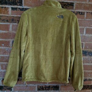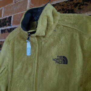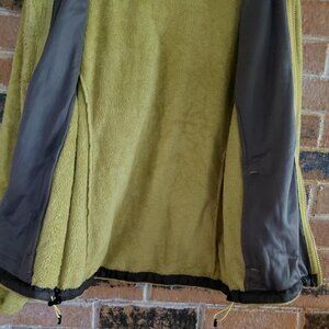 Features a full zip front, stand collar, zip sidepockets, inner drawstring gaither at waist, TNF logo in front and back, high-pile super soft raschel fleece, unlined. Tiny (miniscule) stain at lower front near zipper - see last pic.