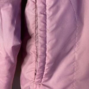 Women’s half zip pullover jacket in pink from The North Face. Gray interior. Stand up fleece lined collar. Secure zip pocket at chest. Hand pockets. Size XS. Approximate flat lay measurements- Bust: 19” across from armpit to armpit. Length: 23”. Some picks along threading (see photos) but otherwise in good preowned condition with no rips or stains.