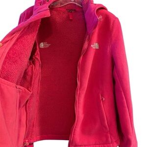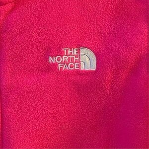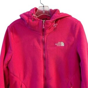 Keywords: The North Face, women's jacket, pink jacket, fall jacket, sherpa lining, casual wear, mid-length jacket, hooded jacket, zip closure, pre-owned.