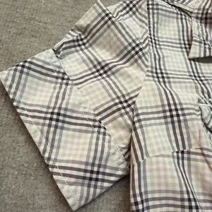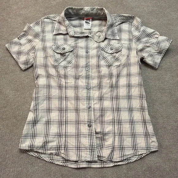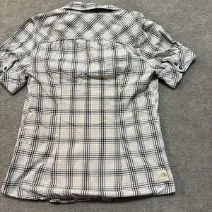 Lightweight and breathable The North Face short sleeve plaid shirt, perfect for hiking, travel, or everyday casual wear. Features dual chest pockets with button flaps, roll-tab sleeves, and classic outdoor style in soft pastel plaid tones of mint green, gray, and white.