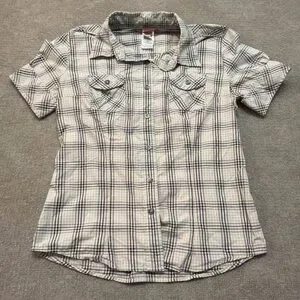 • Features: Button front, short sleeves, double chest pockets, curved hem, TNF patch logo on back