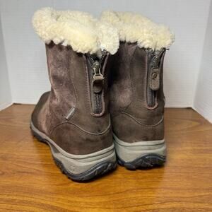 North Face Women's Primaloft Waterproof Snow Boots in Brown, size 9. These ankle boots feature a round toe, zip closure, and a low heel for comfort. Perfect for winter, fall, and spring, these boots are made from a breathable blended fabric with faux fur lining for warmth. Shows signs of wear and light staining on the toe area. See pics. Tread is very good