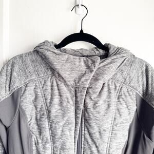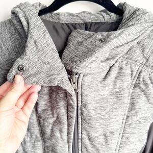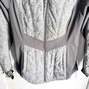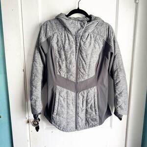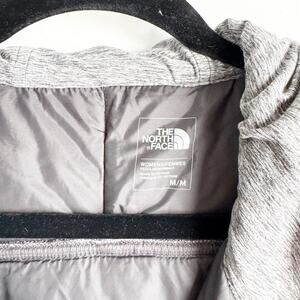 The North Face Women's Pseudio Quilted Hooded Jacket Outdoors Hiking Size Medium {M}. Excellent, preowned condition. Slim-fitting. Synthetic insulation for lightweight warmth. Heather gray color with dark gray panels. High collar, hood, long sleeves, side zip pockets. Full zip with front snap placket. Fitted silhouette.