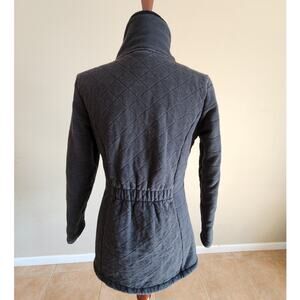 Black Quilted Funnel Neck Full Zip Jacket. Lined. Pockets with zippers. Gathered at waist in back. Long Line. Black color has fade. No rips or tears. In good preowned condition. Smoke free home.