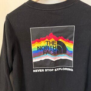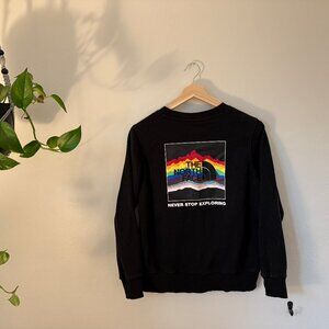 Stay cozy and stylish with this North Face Women’s Crewneck Sweatshirt, featuring a vibrant rainbow mountain graphic on the back and the North Face logo on the chest. Made with a soft cotton-polyester blend, this sweatshirt is perfect for casual wear, layering, or outdoor adventures.