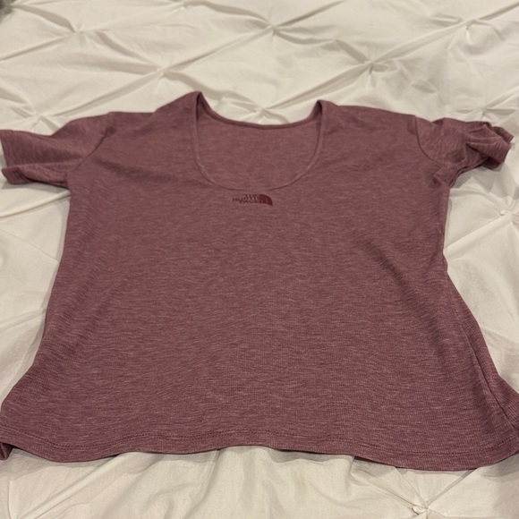 North Face ribbed tee in a dusty rose/plum color. A deep scoop in the back of the shirt with a higher neckline in the front. Only worn once. Pet free and smoke free home.