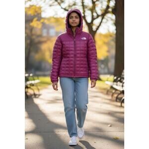 This North Face women's size M plum purple down puffer full zip jacket is a stylish and practical outerwear option for colder weather. Made with nylon outer shell material and filled with cozy down fabric, this jacket provides both warmth and protection. The full zip design and regular fit make it easy to layer over other clothing, while the vibrant purple color adds a fun pop to any outfit. Perfect for staying comfortable and fashionable during the colder months.