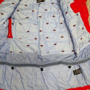 The North Face Women's Ski Jacket Red Insulated Full Zip Hooded Parka Size S is pre-owned condition. Shows signs of wear as noted in photos (dirt stains). The jacket was washed. You may be able to get more of the staining out with a bit more scrubbing. It really it's noticeable due to the color and placement on the jacket. Breakage on the back logo. Fun graphic and great condition on the inner lining.