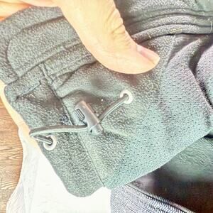 This is a wonderful jacket with a high pile sherpa backing, multiple pockets inside and outside, cinch-cord waistband, and is windproof (Windwall) and water-repellent. Does not have a hood and comes in a black and white herringbone pattern.