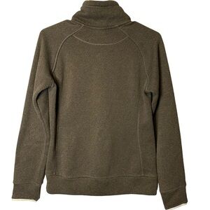 The North Face Women’s Small Brown Khaki Fleece Long Sleeve Zip-Up Jacket A58R. Has a bit of army drab/green tone to it in lighting. Great condition see photos for details. Approximate measurements 24” shoulder to hem and 18” pit to pit.