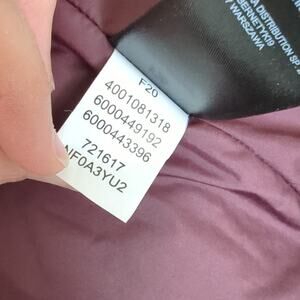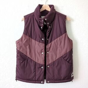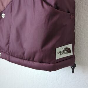 The North Face women's vest size small puffer jacket polyester style number NF0A3YU2 snap button closure retro looking vibe has pockets purple, pink, brown North Face logo length 25. flat across underarm 21 Excellent condition.