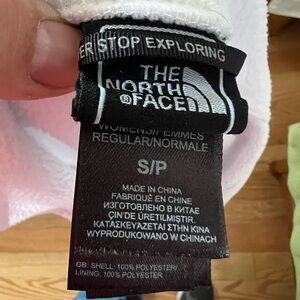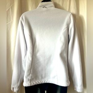 Cute North Face full zip Fleece in white, silver/gray front shoulder logo. Wrist snaps indicate it can be worn under a lightweight shell and secured for comfort. Womens Sz S/P