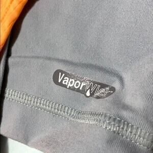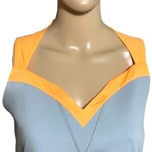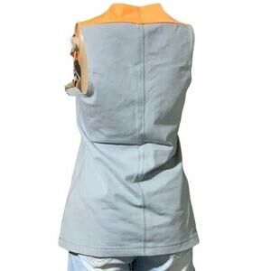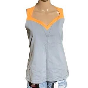 Gray sleeveless tank top with an orange trimmed sweetheart v-neck