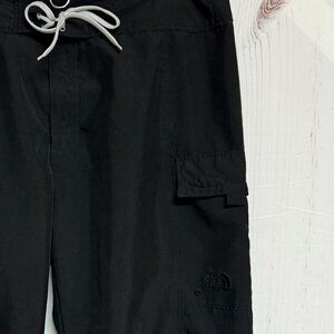 The North Face women’s wide leg capri pants in black, size 10. Made from lightweight 100% polyester with a comfortable drawstring waist. Features a relaxed wide-leg fit, one side cargo pocket with flap, and embroidered The North Face logo. Super lightweight — almost like board shorts but in a longer capri pant length.