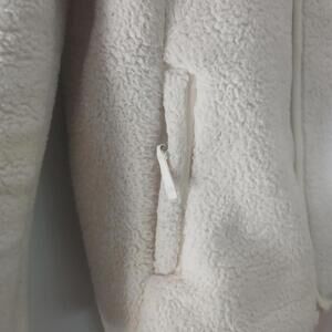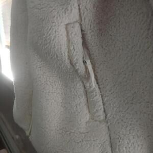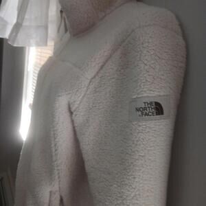 The product is a stylish and cozy North Face XL full zip Sherpa fleece jacket designed for girls. It features a solid ivory color and is perfect for casual occasions during the winter, fall, and spring seasons. The jacket is made of polyester with a fleece lining, providing warmth and comfort. With a regular fit and long sleeves, this basic jacket also has zipper closures, embroidered logos, and is an ideal choice for girls looking for a fashionable and functional outerwear option.