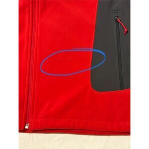 From smoke and pet free home. There is a cut mark on the front of the jacket, clearly shown in photos. Otherwise the jacket is perfect. Weather resistant, Fleece backer, hem cinch cord.