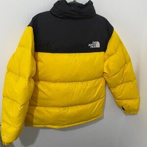 Stay cozy in this vibrant The North Face puffer jacket. Featuring a bold yellow and black design and the iconic brand logo. It has a durable zipper, adjustable hood, and practical pockets.