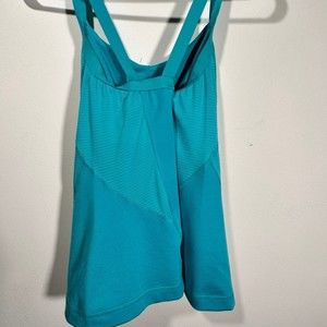 This is an aqua mint green north face tank built-in bra crisscross back I say compression but it’s not super tight. It has breathable mesh on both sides laying flat pit to pit is 14 inches total length is 17 1/2 inches across the bottom is 18 1/2 inches preowned in good condition.