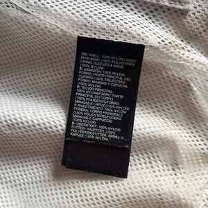 The North Face blue rainjacket in kids' size XXS (5). Solid blue nylon shell with light gray lining, solid in the sleeves and hood and mesh in the body. Slightly longer parka length, great for rain protection. GUC; light but extensive discoloration on the front zipper flap, cuffs and some other fabric edges (see photos).