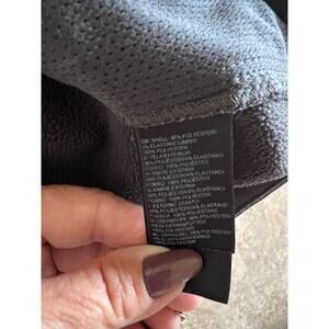 The North Face full zip, fleece lined jacket. Has drawstring waist. * See last two photos. There is a burn hole in back of sleeve, also there is a rub mark on front- slight fuzzing of fabric. Neither affects the wearability of the jacket.