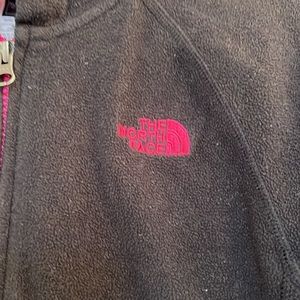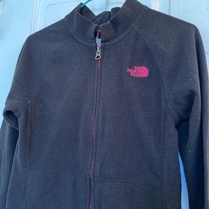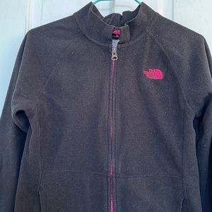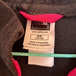 The North Face girls fleece jacket in size medium 10-12. Features front pocket pockets and in excellent used, like new condition. Fabric is lightweight 100% polyester fleece.