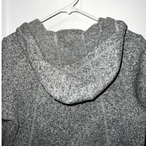 The North Face sweater fleece full-zip jacket, in great condition (has only been worn once or twice), has a hood and front pockets, made of polyester, heathered gray color as pictured, North Face logo on the left chest, size small (true to size in my opinion)