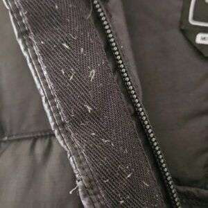 Black, hip length, womens size medium, detachable hood. Some wear, see pics, lots of life left!!! Losing a few feathers here and there but nothing a little repair/tenacious tape can't fix.