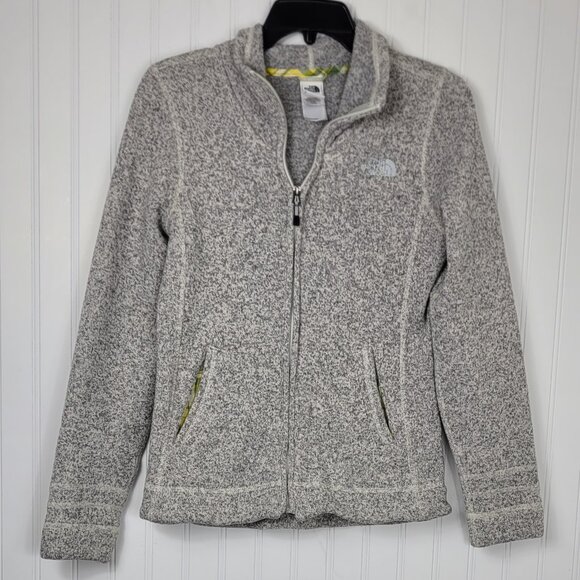 The North Face light gray blend Zip up jacket w/Fleece lining, inside & outside pockets 100% Polyester, machine wash delicate, Women's S/P, Good Used Condition