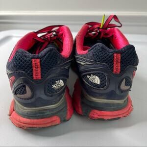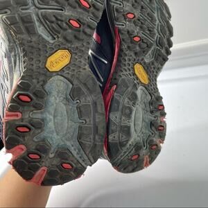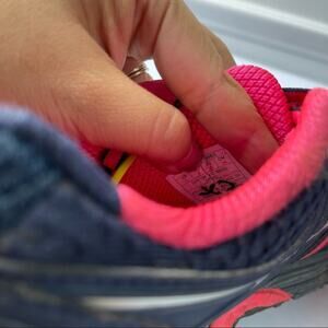 Dark navy blue in color with coral pink highlights. Pink & black laces with bright neon yellow tips. Reflective heels for high visibility in low light conditions. Vibram Soles.
