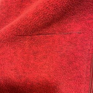The North Face woman’s red/orangeish zip up fuzzy jacket. On the right front side there is a slash in the jacket and a rough patch. Please see pictures for details. The slash is just superficial. It’s a size Small.