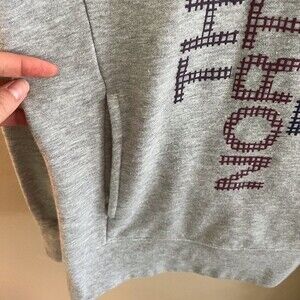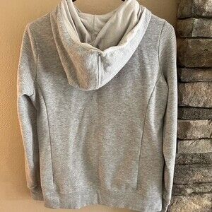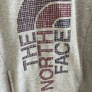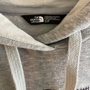 The North Face womens gray hooded sweatshirt with north face logo in red and purple on front. Front pocket. Size S.