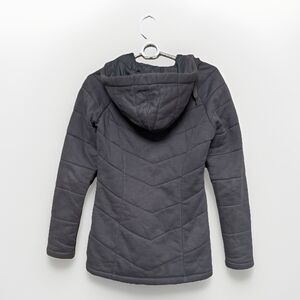 The North Face women's size XS hooded full zip puffer jacket is a stylish and practical outerwear option for colder seasons. Made of durable polyester with a softshell fabric type, this mid-length jacket features a solid gray color with a full zip closure and a hood for added protection. Perfect for casual occasions, this regular fit jacket is machine washable and includes long sleeves to keep you warm and comfortable during the winter, fall, and spring seasons. The North Face brand ensures quality and outdoor style with this puffer jacket.