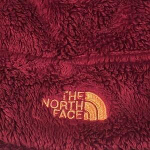 Cozy fleece beanie by The North Face. wine colored with orange logo