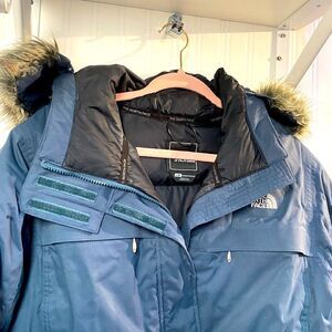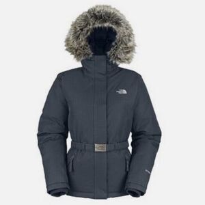 Stylish gray parka with a fur-lined hood by The North Face. Perfect for cold weather.