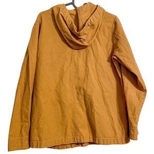 Features: long sleeves, attached hood with drawstring closure, zipper and snap closure, side pockets, unlined, khaki