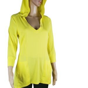 (Q) The North Face Yellow & Gray Pinstriped 3/4 sleeve Hoodie T-shirt tunic, pockets, Size small