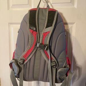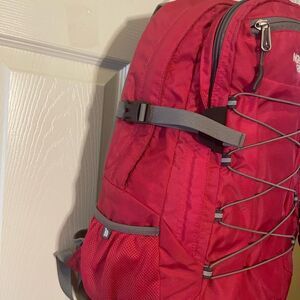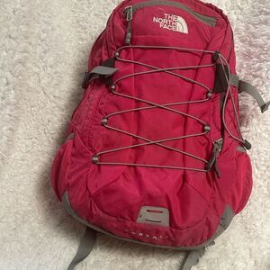 Stylish vibrant pink backpack by The North Face. Features adjustable straps and front bungee cord.pre owned in good used condition the bottom clip missing a part still works see all pictures any questions please message.