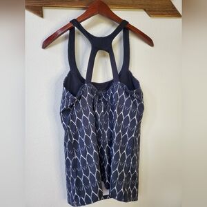 Excellent condition womens Northface tank. Geometric print. Stretchy. Built in bra. Racerback. Size L pit to pit flat lay 17" length 20" measurements are approximate