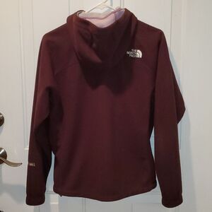 This is a The North Face Windwall jacket with hood. It has a full zipper up the front and zippered handpockets.