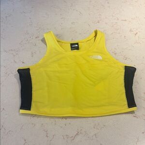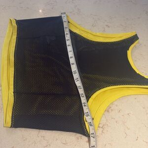 Bright yellow sports bra with black mesh sides. Perfect for workouts.